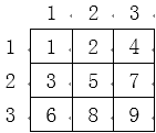 马里奥是一个快乐的油漆工人,这天他接到了一个油漆任务,要求马里奥把一个 nm 列的矩阵每一格都用油漆标记一个数字,标记的顺序按照广度优先搜索的方式进行,也就是他会按照如下方式标记: